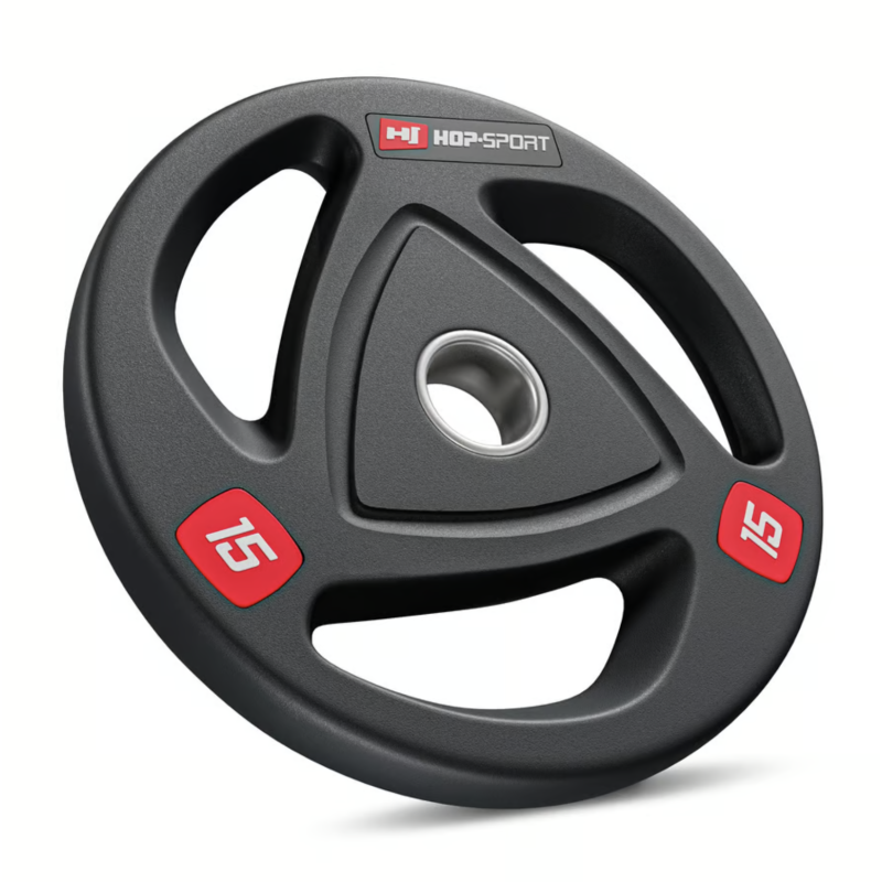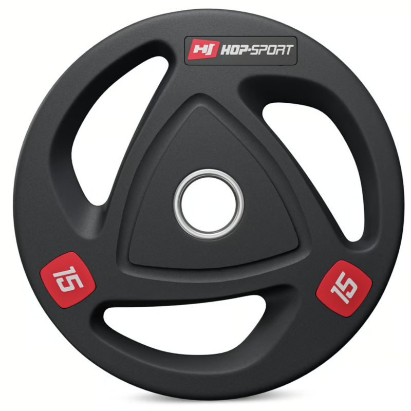 Олімпійські диски 15 кг виготовлені з прецизійного чавуну, покриті антиковзким шаром міцної гуми, яка ефективно амортизує диски при їх падінні і додатково заглушає звуки при падінні. Кільце з нержавіючої сталі в центрі диска з діаметром 51 мм гарантує їм високу міцність і забезпечує точну посадку на штангу. Вага витиснена на дисках, що спрощує їх ідентифікацію, а також спеціальні пази унікальної форми, що виконують роль ручок та підвищують комфорт використання.