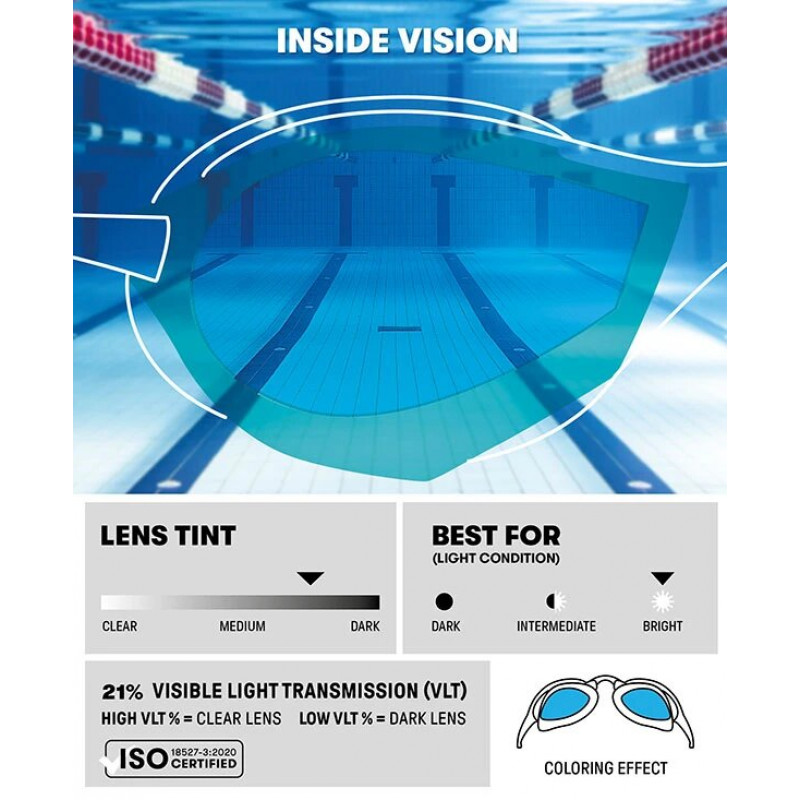 Ідеальні окуляри для триатлоністів COBRA TRI SWIPE MR з тривимірною прокладкою для кращого прилягання та комфорту, а також щоб вода не потрапляла на лінзи. Тепер із застосуванням найкращої з доступних технологій захисту від запотівання, яку можна повторно активувати простим проведенням пальця по лінзам, що працює в 10 разів довше. Коли окуляри запотівають, активуйте революційну протитуманну захисну плівку Swipe, обережно проведіть пальцем по внутрішніх лінзах п'ять разів, поки окуляри перебувають у воді.