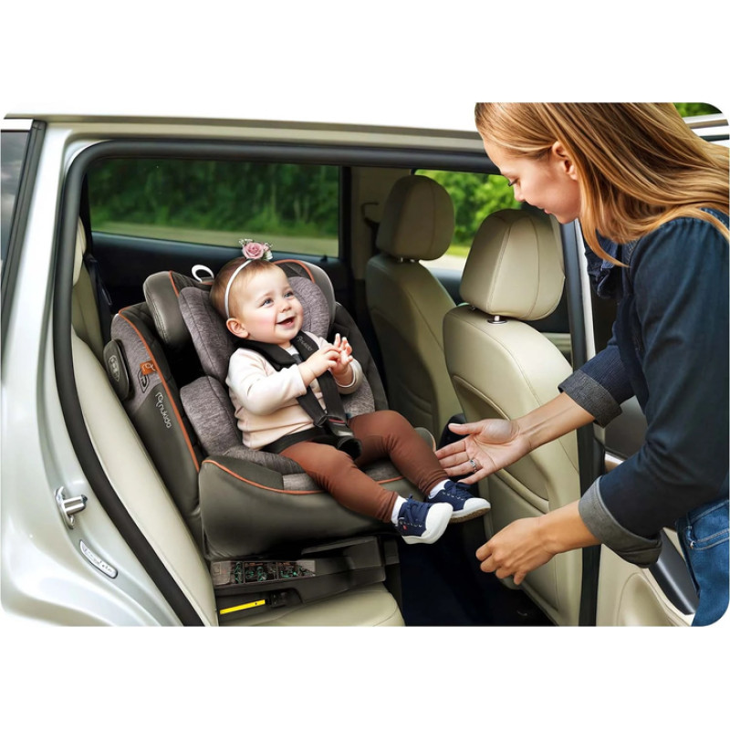 Поворотна конструкція забезпечує легкий доступ до дитини з обох боків, що значно полегшує пристібання ременя безпеки та виймання дитини. Можливість фіксації в 4 положеннях забезпечує комфорт у будь-якій ситуації.