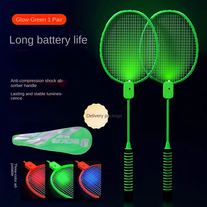 Набір для бадмінтону з яскравою LED-підсвіткою — ідеальний вибір для активного відпочинку в будь-який час доби. До комплекту входять дві ракетки та волани, виконані в стильному поєднанні неонових кольорів (зелений та оранжевий).