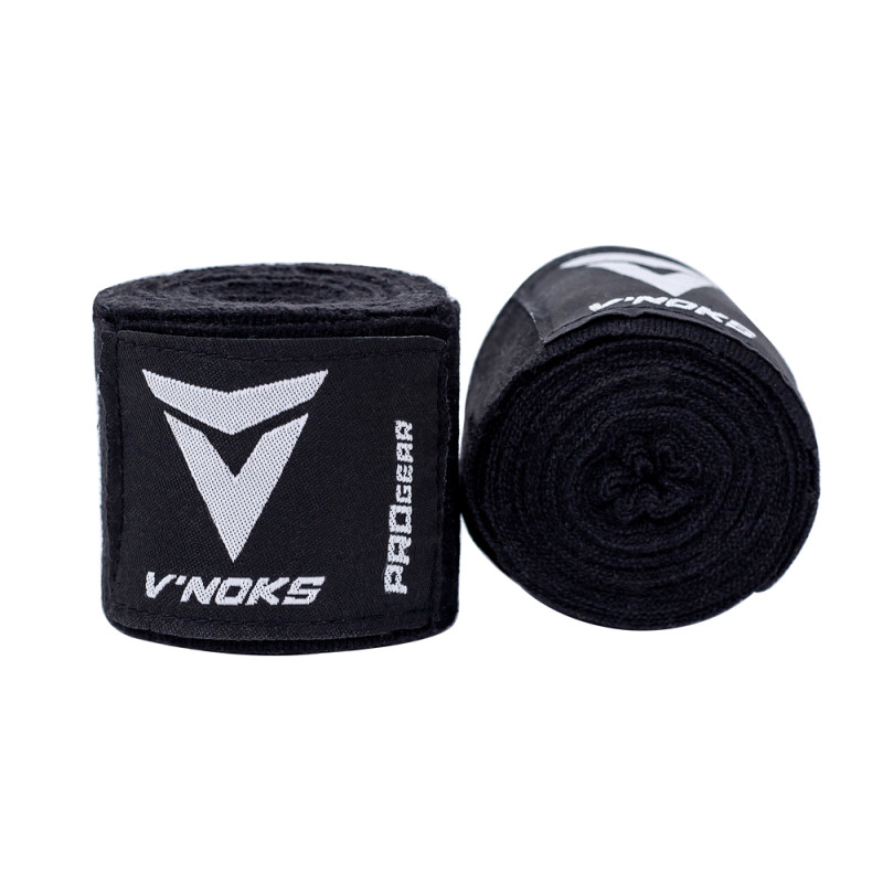 Бинти боксерські V'Noks (Вінокс) 4,5 м використовуються для фіксації зап'ястя і захисту рук при заняттях різними видами бойових мистецтв: боксом, кіксбоксингом, ММА, муай тай. Практичний варіант для будь-якого спортсмена від V'Noks (Вінокс): виконані в чорному кольорі, відрізняються помірною еластичністю (склад: 70% бавовна, 30% нейлону), прикрашені лейблами впізнаваного бренду. Завдяки максимальній довжині дозволяють виконувати різні види обмотки.