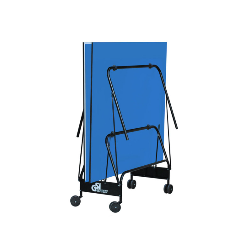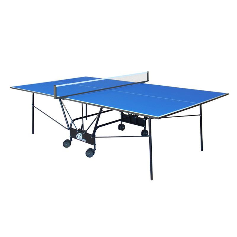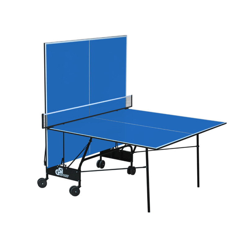 Тенісний стіл для закритих приміщень. Як матеріал для ігрової поверхні використовується спеціально оброблена деревостружкова плита (ДСП) товщиною 16 мм. На ДСП нанесене спеціальне покриття антивідблиску пластикове покриття синього кольору. Тенісний стіл базується на компактному зручному візку, виготовленому з металевого трубчастого профілю діаметром 25 мм з поліефірним покриттям. Конструкція столу дозволяє тренуватися поодинці. Стіл легко переміщається на 4-х здвоєних колесах діаметром 107 мм, 2 колеса маневрені.