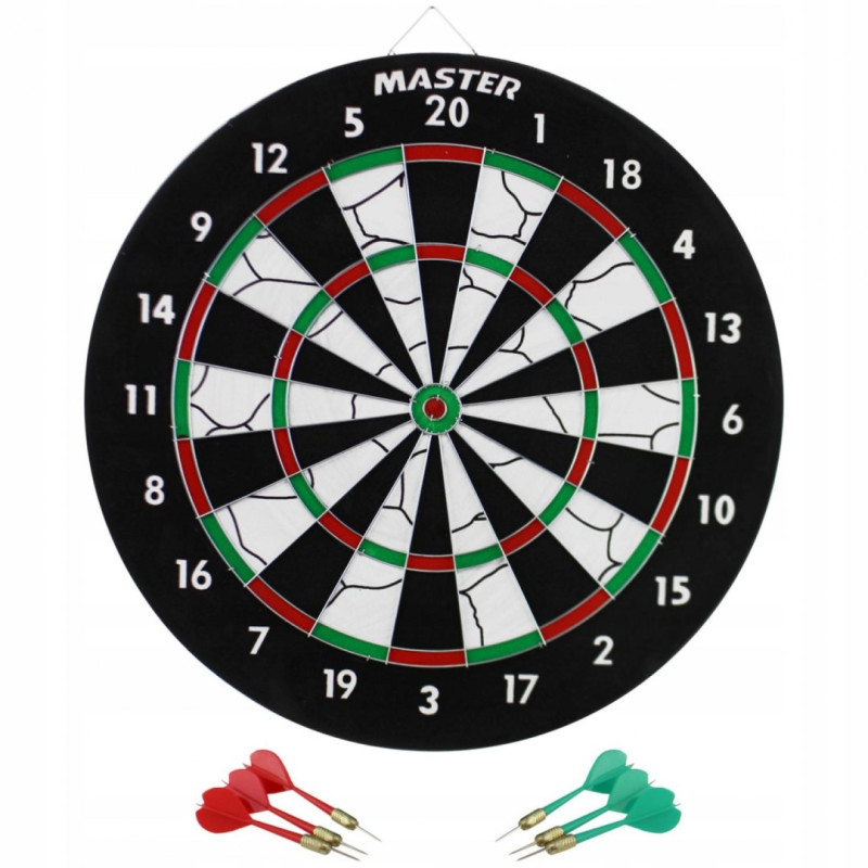 Дартс двосторонній MASTER діаметром 37 см і шістьма дротиками. Зручне рішення для двох цілей в одному продукті. Разом з дротиком ви отримаєте шість дротиків вагою 18 г.