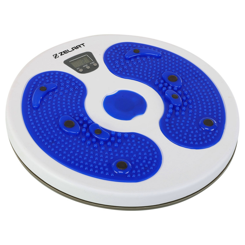 Диск здоров'я Zelart FI-5450 виготовлений з ударостійкого ABS-пластику й обладнаний електронним лічильником, що дає змогу відстежувати прогрес тренувань. Конструкція диска складається з нижньої 3-точкової пластини, яка залишається нерухомою під час занять, і платформи, що обертається. У платформу інтегровано масажні елементи, що впливають на акупресурні вузли стоп. Крім того, диск обладнаний 8 магнітними елементами, що позитивно впливають на кровообіг і обмін речовин. Twist-диск має діаметр 27 см і витримує навантаження до 90 кг.