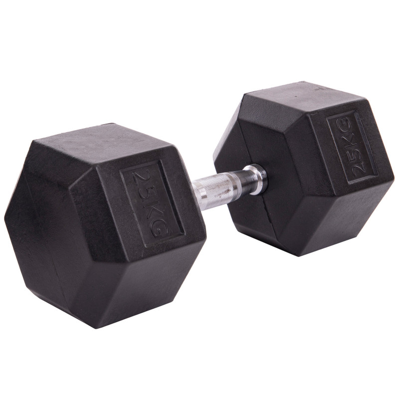 Гумована гантель гексагональної форми SP-Planeta LN-1205-25 виконана з цільного металу, що забезпечує тривалий термін служби і високу міцність. Шестигранна форма головок запобігає скочуванню гантелі з горизонтальних і похилих поверхонь. Вага (в кілограмах) вказана на кожній голівці, тому пошук снаряда потрібної ваги не займе багато часу. Насічки на руків'ї сприяють більш комфортному хвату і покращують зчеплення з долонею. Металева гантель має компактні розміри порівняно з пластиковими моделями, тому займає менше місця під час зберігання.
