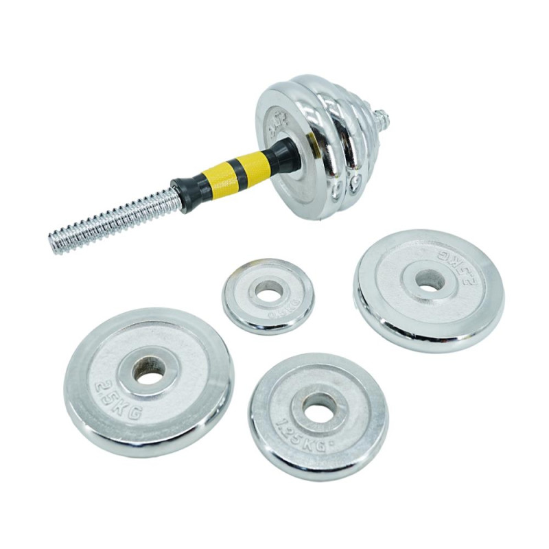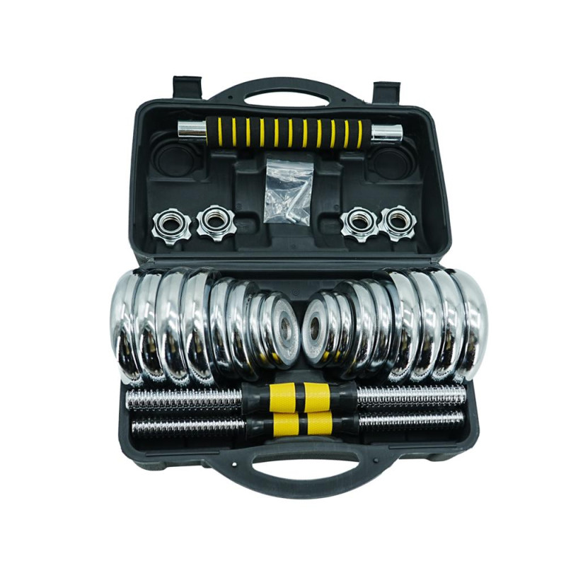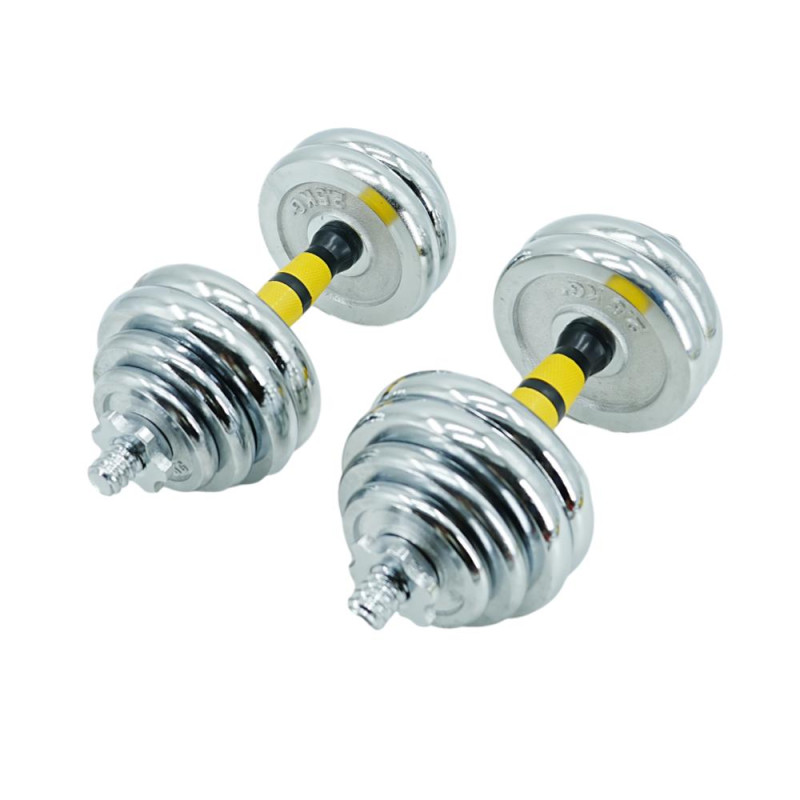 Гантелі виготовлені з високоякісної хромованої сталі та мають стильний, естетично привабливий дизайн. Комплект включає два грифи, два замки і набір вагових млинців. Для забезпечення максимального комфорту та безпеки тренувань на центральну частину грифів (область захоплення) нанесені насічки, що запобігає ковзанню долоні. У той же час зіркоподібні замки (гайки Вейдера) дозволяють швидко зібрати/розібрати гантелі та забезпечують надійну фіксацію млинців – вони не бовтаються і тим більше не можуть впасти.