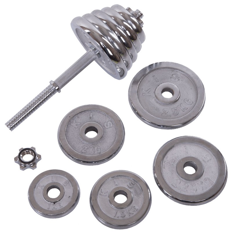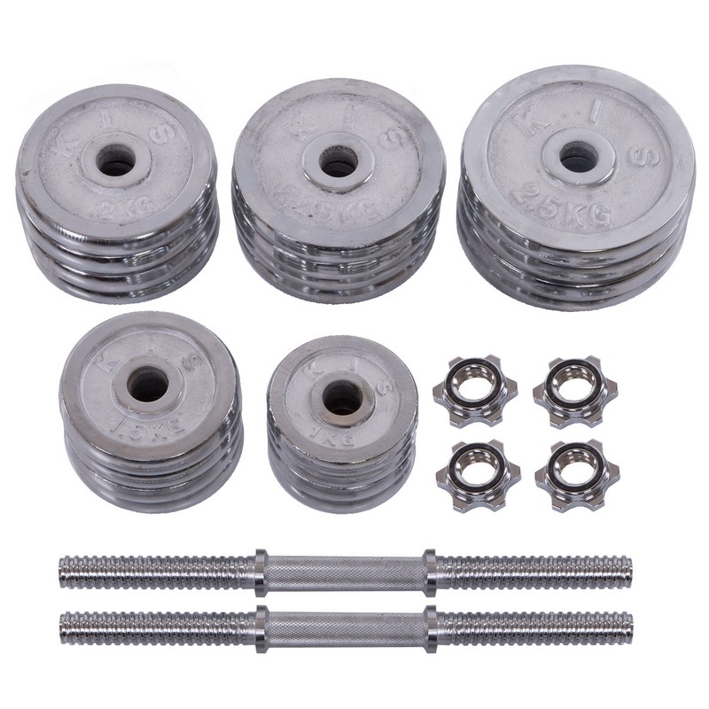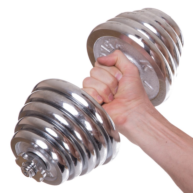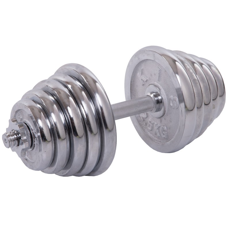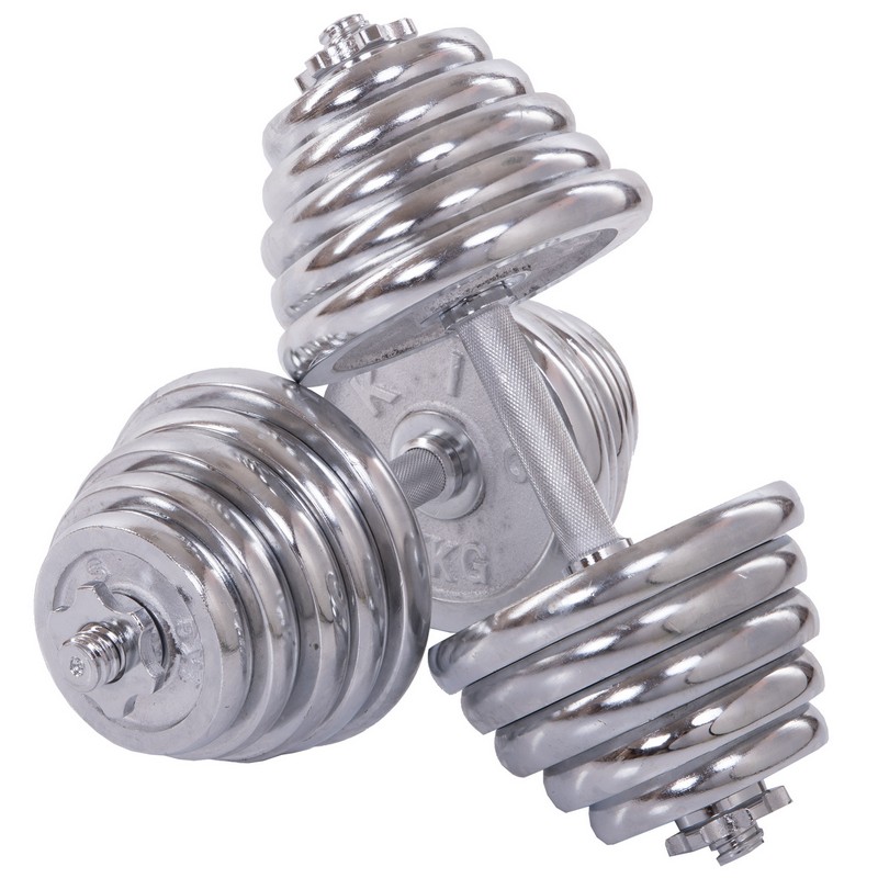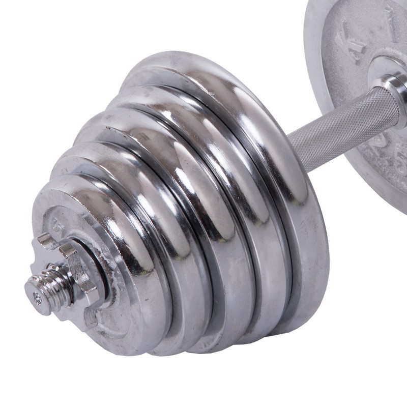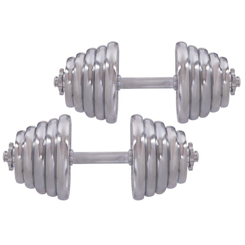 Щоб тренуватись у силовому стилі, необов'язково відвідувати тренажерний зал. Завдяки комплекту гантелі по 20 кг кожна ви зможете тренуватися в домашніх умовах і виконувати вправи на всі групи м'язів. Металевий гриф гантелі має довжину 40 см, що робить захоплення зручним для користувачів із будь-яким розміром руки. Додатковий комфорт забезпечують насічки на грифі, які перешкоджають ковзанню рук. У наборі також є сполучна муфта, за допомогою якої можна зібрати штангу із двох гантелей. Висока міцність з'єднання досягається за рахунок різьблення. Аналогічно за допомогою різьблення на грифі фіксуються замки. Усі диски хромовані та захищені від корозії.