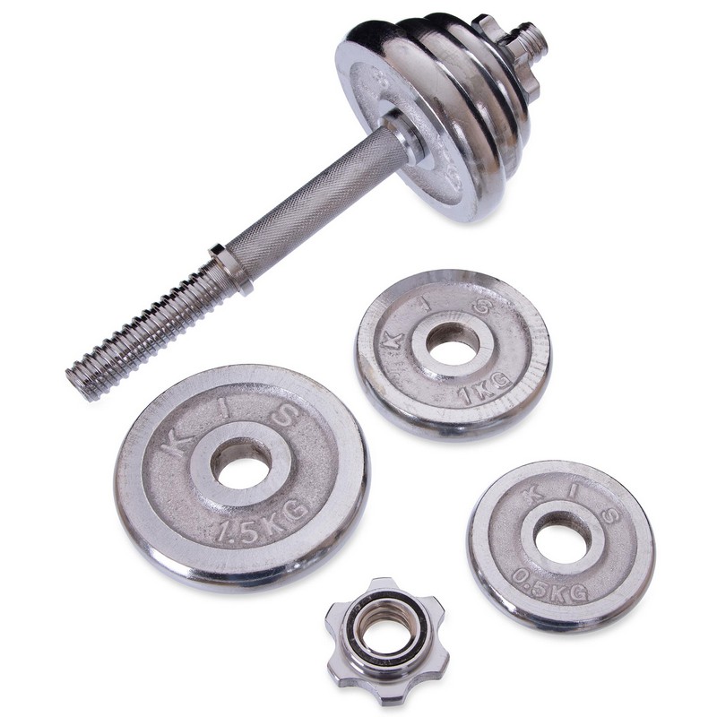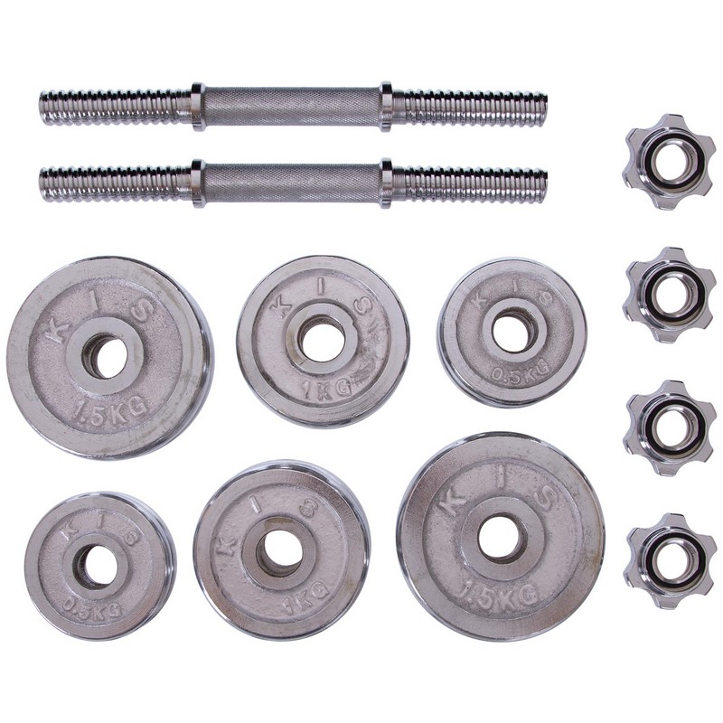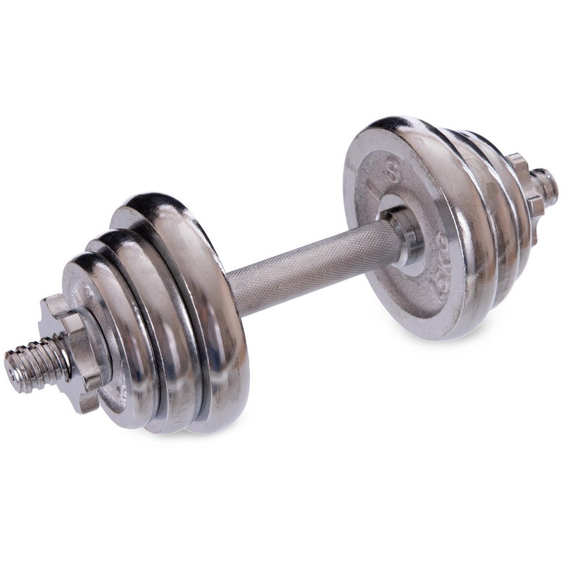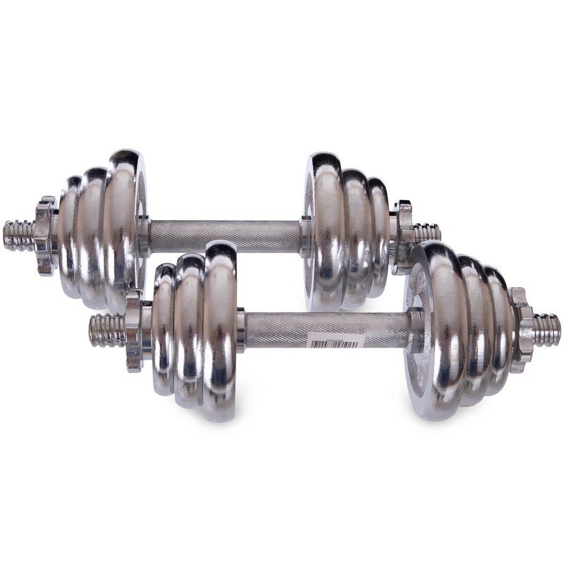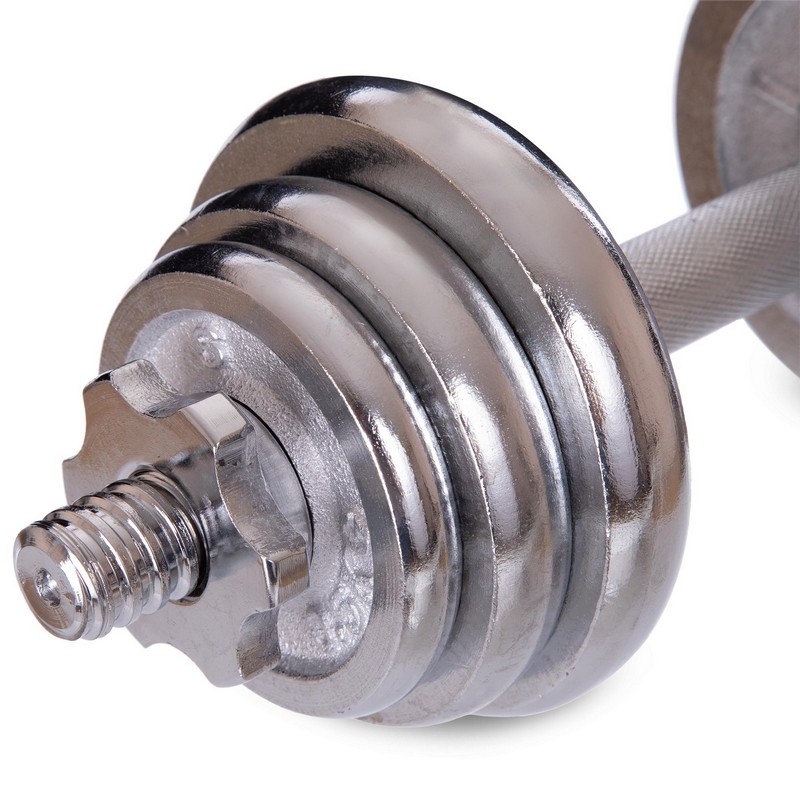 Розбірні гантелі виготовлені з металу та мають загальну вагу 15 кг. Вони укомплектовані дисками різної ваги, а також замками на різьбленні. Довжина грифу складає 40 см і дозволяє зручно захопити спортивний снаряд. Хромовані металеві гантелі мають великий запас міцності і тривалий термін експлуатації. При цьому така вага виглядає набагато компактнішою, ніж, наприклад, у випадку пластикових гантелей. На рукоятках є насічки, які запобігають ковзанню рук під час виконання вправ. На кожному диску вказано вагу.