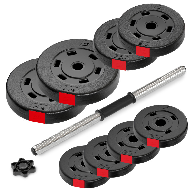 Комплект поставляється з прямим грифом із гвинтовими зажимами, загальною довжиною 52см і діаметром 30 мм. Він досить довгий, щоб при необхідності вмістити додаткові диски.