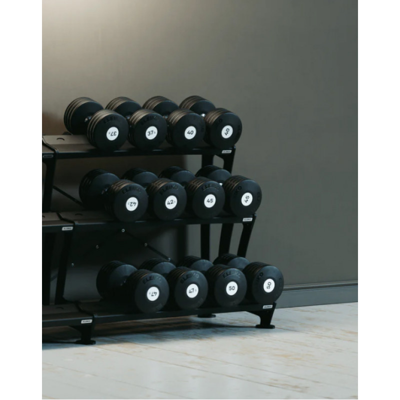 Гантелі Eleiko Plate покращують тренувальний досвід завдяки скошеній формі головки, що зручніше для зап’ясть і передпліч, а також при розміщенні гантелі на стегнах. Плавне обертання ручки зменшує навантаження на суглоби під час вправ. Завдяки модульній конструкції, ці гантелі дозволяють залам адаптувати вагові набори під індивідуальні потреби, розширюючи доступний діапазон навантажень.