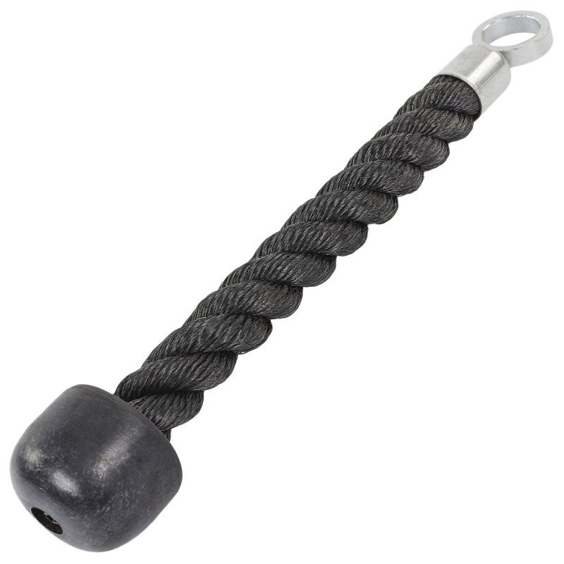 Основою канатної рукояті є міцний плетений трос із високоякісного поліпропіленового волокна. З одного боку до нього прикріплений міцний металевий підвіс із вушком під карабін, що дозволяє використовувати даний аксесуар практично на будь-якому блочному тренажері. З іншого боку, надійно зафіксовано великий гумовий упор для запобігання зісковзування руки під час тренування.