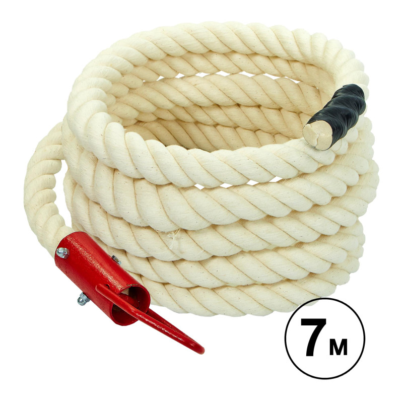 Спортивний канат виготовлений із міцних бавовняних волокон. Натуральний матеріал м'який на дотик, не викликає подразнень на шкірі та вирізняється практичністю у використанні. Довжина каната становить 7 метрів, а діаметр - 4,5 см, що дає змогу міцно захопити його руками. З одного краю канат обладнаний металевим кріпленням, а на іншому закріплений термозбіжною трубою, що запобігає розплітання. Для з'єднання каната з кріпленням використовуються тільки найякісніші болти з шестигранною головкою і гайки стандарту DIN 931, DIN 933, DIN 934.