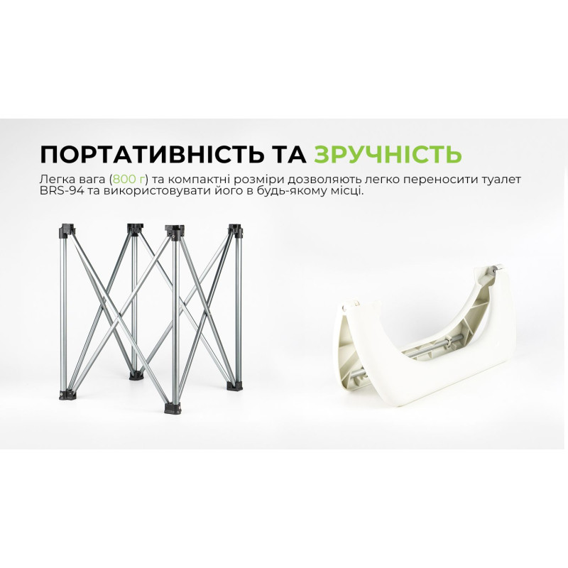 Завдяки компактності і легкій вазі, що дорівнює 800 грамам, туалет BRS-94 можна легко переносити і використовувати у будь-якому місці, де потрібен тимчасовий туалет.