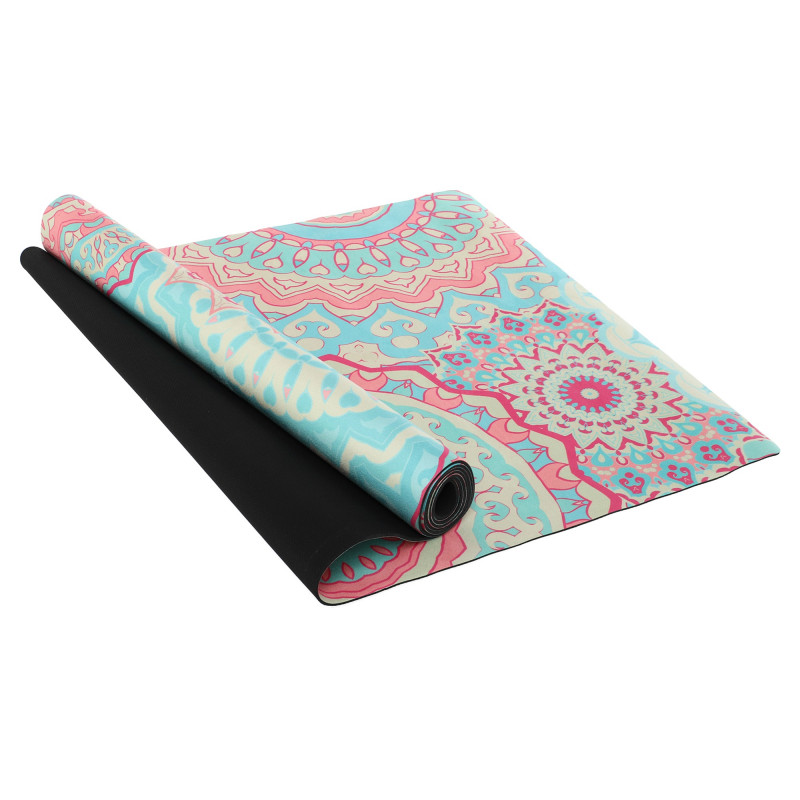 Двошаровий килимок складається з шару каучуку та шару замші. Замшевий верх має цікавий принт, який дає змогу не тільки комфортно тренуватися, а й отримувати естетичне задоволення від занять. Лицьова поверхня килимка не слизька. Відмінною липкістю володіє тильна сторона, виготовлена з каучуку. Цей матеріал добре прилипає до різних покриттів і точно не буде ковзати.