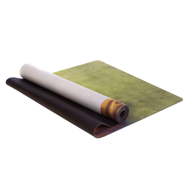 Двошаровий килимок складається з шару каучуку та шару замші. Замшевий верх має цікавий принт, який дає змогу не тільки комфортно тренуватися, а й отримувати естетичне задоволення від занять. Лицьова поверхня килимка не слизька. Відмінною липкістю володіє тильна сторона, виготовлена з каучуку. Цей матеріал добре прилипає до різних покриттів і точно не буде ковзати.