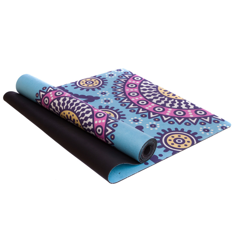 Двошаровий килимок складається з шару каучуку та шару замші. Замшевий верх має цікавий принт, який дає змогу не тільки комфортно тренуватися, а й отримувати естетичне задоволення від занять. Лицьова поверхня килимка не слизька. Відмінною липкістю володіє тильна сторона, виготовлена з каучуку. Цей матеріал добре прилипає до різних покриттів і точно не буде ковзати.