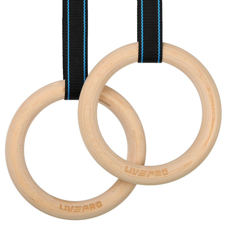 Гімнастичні дерев'яні кільця LiveUp для кросфіту виготовлені з довговічних матеріалів високої якості та здатні витримувати навантаження до 200 кг. Для виготовлення кілець використовується міцна березова деревина товщиною 32 мм. Матеріал легкий і стійкий, після ретельного шліфування та полірування ручки зберігають природну текстуру дерева, що забезпечує відмінне зчеплення з долонею. Кожне кільце комплектується міцним ременем і металевою застібкою-пряжкою. Ремінь довжиною 460 см дає змогу відрегулювати зручну висоту кілець у будь-якому приміщенні та надійно зафіксувати її за допомогою пряжки. Вага одного комплекту становить лише 1,66 кг. Гімнастичні кільця зручно зберігати та транспортувати, їх можна використовувати для тренувань у приміщенні та на вулиці.