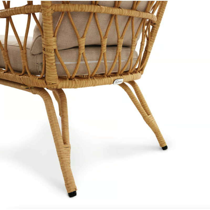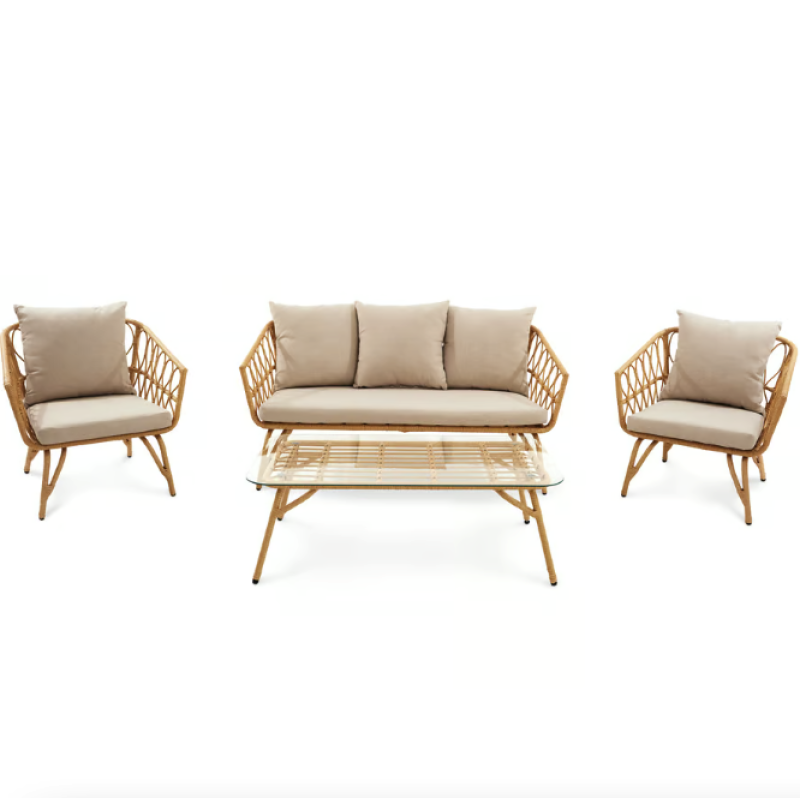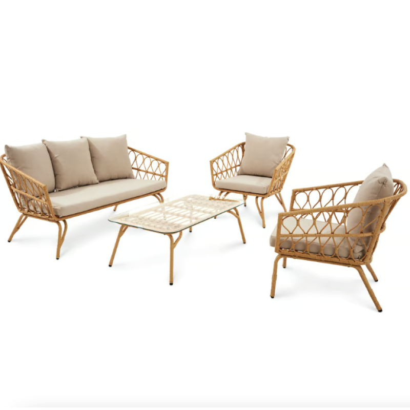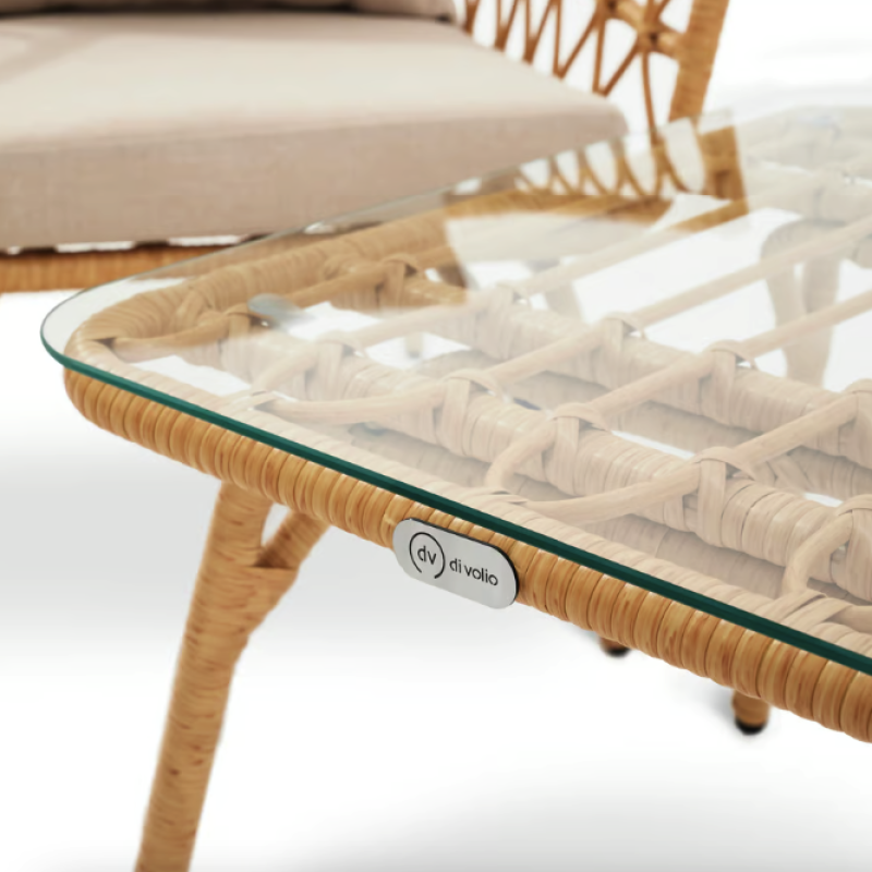 Комплект садових меблів Teramo від Di Volio - це зручний і функціональний набір меблів, який буде красиво виглядати як в саду, так і на терасі. Гарнітур виділяється своєю ажурною формою та дизайном, що відсилає до стилю традиційних меблів з натурального ротанга та лози. Конструкція меблів для тераси являє собою сталевий каркас, обплетений високоякісними волокнами техноротанга, які, на відміну від натурального ротанга, мають високу стійкість до шкідливого впливу вологи та сонячних променів. У комплект входить 3-місний диван, два крісла із заокругленими спинками та журнальний столик зі скляною стільницею. Доповнюють усе це м'які подушки з просоченої тканини світло-сірого відтінку.