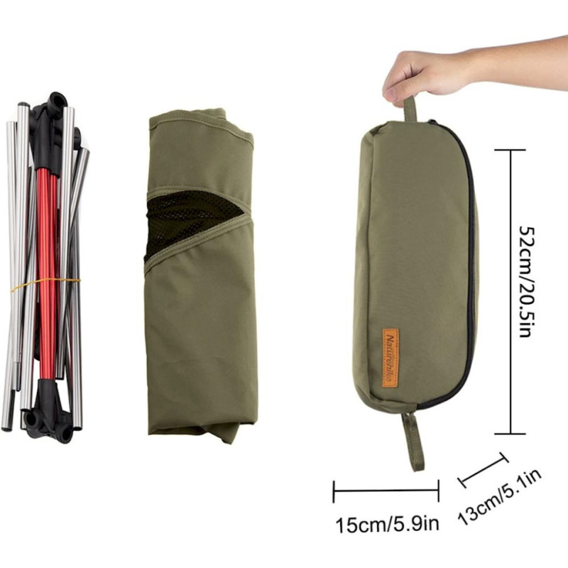 У встановленому положенні розміри моделі сягають 44 х 46 х 103 см. На каркасі можна закріпити сумку-органайзер, щоб смартфон, ключі та інші дрібні речі завжди були під рукою під час відпочинку. Ця сумка також є чохлом для зберігання крісла, яке складається до 56 х 18 х 15 см.