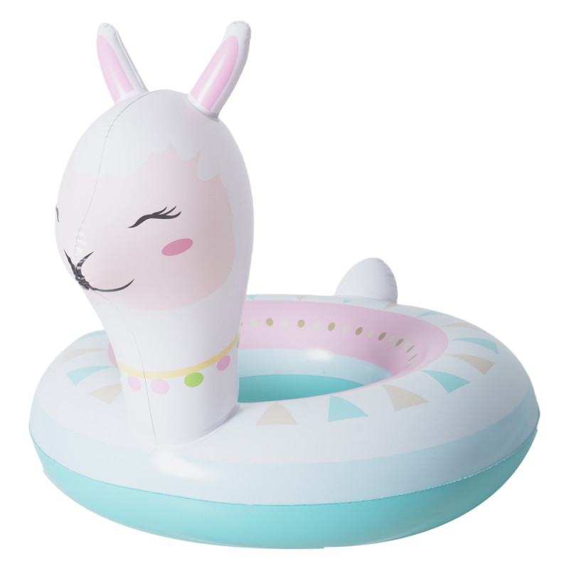 Цей дитячий надувний круг виконаний у вигляді чарівної білої лами. Дизайн поєднує ніжні пастельні тони та милі графічні елементи, що робить його привабливим аксесуаром для літнього відпочинку в басейні або на морі.