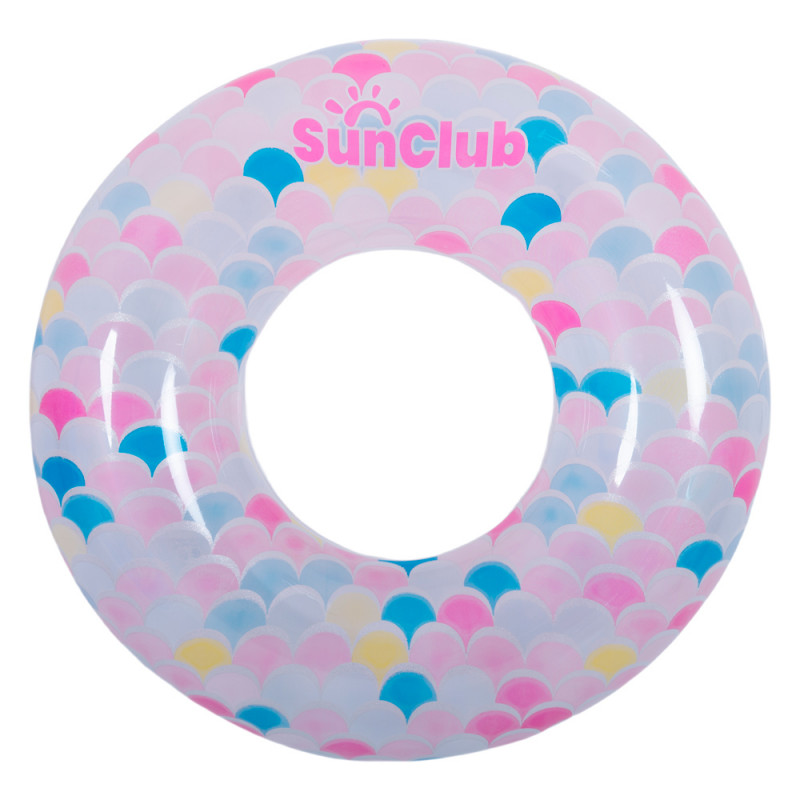 Надувний круг призначений для відпочинку на воді. Конструкція виконана у формі кільця з внутрішнім отвором для розміщення користувача. Матеріал виготовлення — ПВХ, стійкий до впливу води та механічних навантажень. Поверхня оформлена принтом у вигляді луски з поєднанням кількох кольорів. Діаметр круга становить 90 см, що підходить для старших дітей та підлітків. Клапан використовується для накачування повітря та герметичного закривання після наповнення. У складеному вигляді виріб займає мало місця, що полегшує транспортування. Використовується в басейні або на відкритих водоймах. Рекомендований вік — від 9 років. Модель бренду SunClub.
