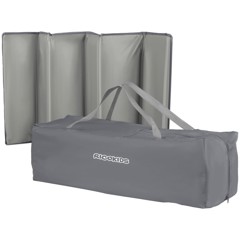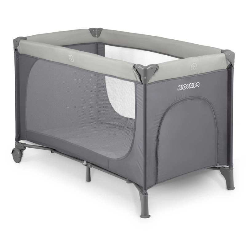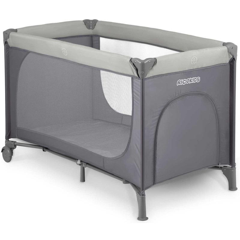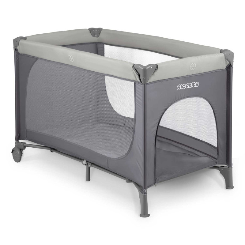 Зручне та функціональне розкладне дворівневе туристичне дитяче ліжечко Ricokids - легке з бічним входом, практичною кишенею, відском для іграшок, пеленальним столиком, органайзером. Тканина легко чиститься.