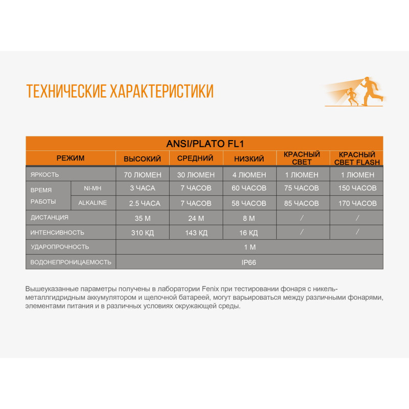В якості основного світлодіода використаний Сгее XP-E2 R3. Він дає нейтральний білий світ, що сприймається оком, як природний. Максимальна яскравість ліхтаря становить 70 люмен, всього є п'ять різних режимів. Fenix HL16 може пропрацювати до 75 годин без підзарядки. Також є два червоних світлодіода, які можуть давати постійний світло або миготливий.