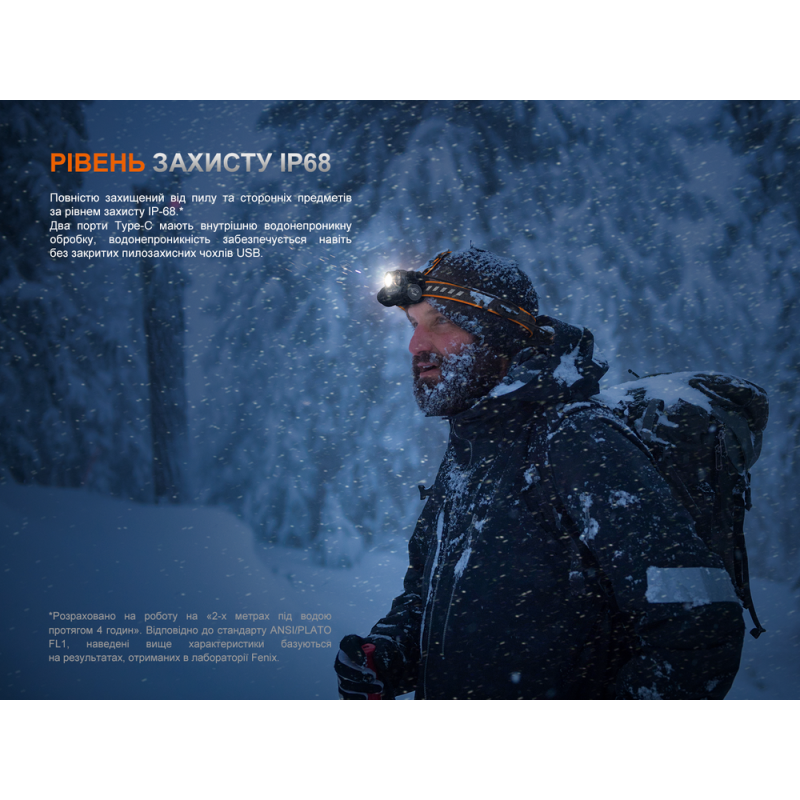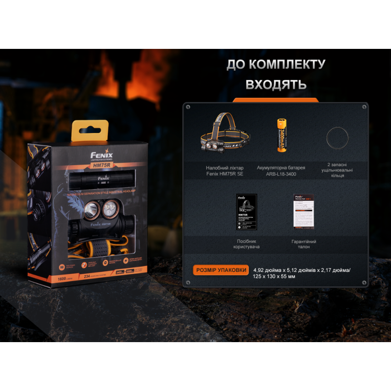 Ліхтар Fenix HM75R з налобним кріпленням, li-ion акумулятор ARB-L18-3400, зарядний кабель USB Type-C, запасне ущільнювальне кільце, гарантійний талон, інструкція користувача.