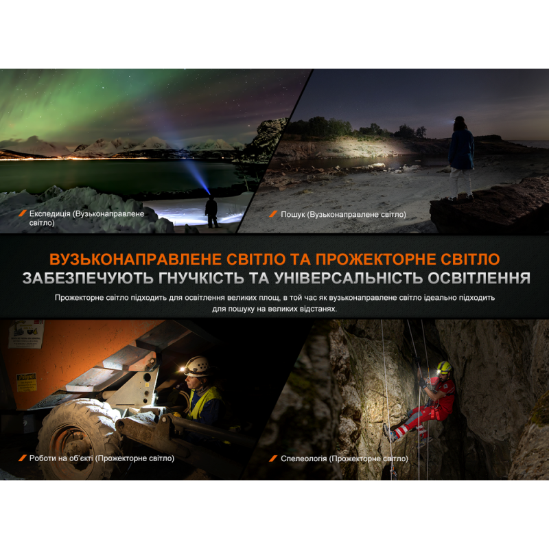 - Турбо: 1000 лм – 60 м – 1 год 50 хв – 1071 кд;