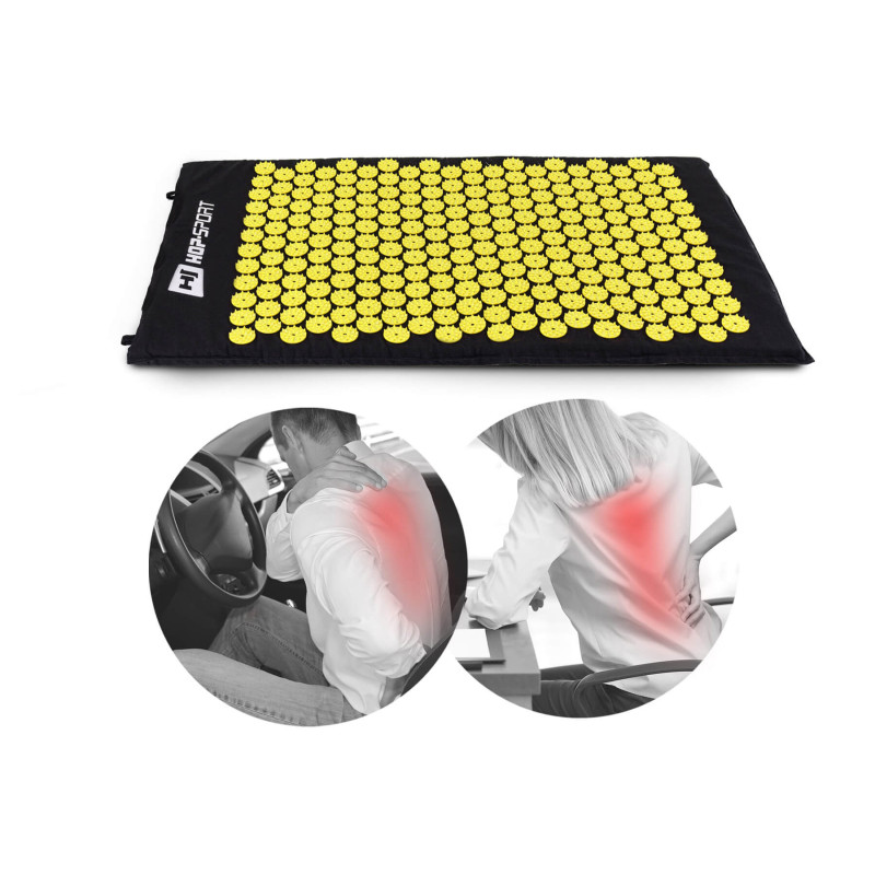 Мат для акупунктури HS-C072AM жовтий Мат для акупунктури - це простий у використанні і ефективний засіб для релаксації, який завдяки своїй дії допомагає зняти напругу м'язів і покращує кровообіг. Рекомендується, зокрема, людям, що страждають від болю в спині, головного болю, а також в разі безсоння. Килимок HS-C072AM оснащений 6210 пластиковими шипами, розміщеними на спеціально розроблених розетках, які забезпечують інтенсивний розслабляючий масаж всього тіла.