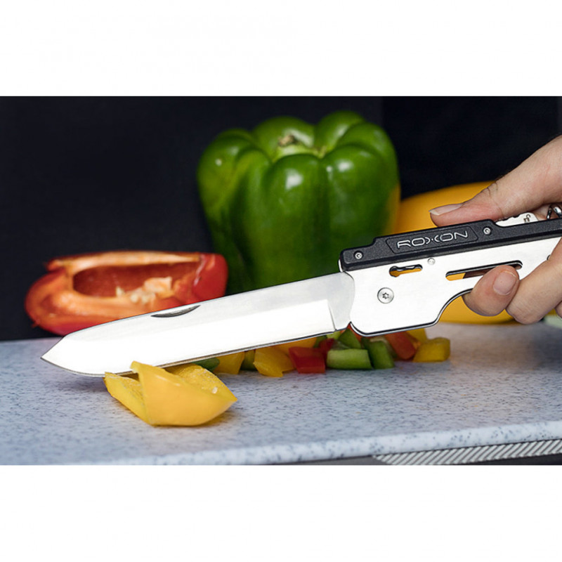 Ніж Drop Point з прямим заточуванням спрощує нарізання та обробку харчових продуктів, допомагає перевірити готовність стейка та розділити страву на порції для подачі. Відкритий клинок завдовжки 13 см фіксується за допомогою механізму Safety lock, який не дає лезу скластись під час навантаження. Ніж ховається в руківʼя мультитула для транспортування.