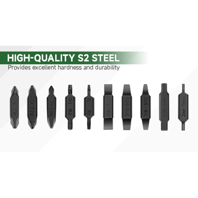 У комплекті є 10 двосторонніх біт — цілих 20 варіантів насадок, сумісних з поширеними типами кріплень!