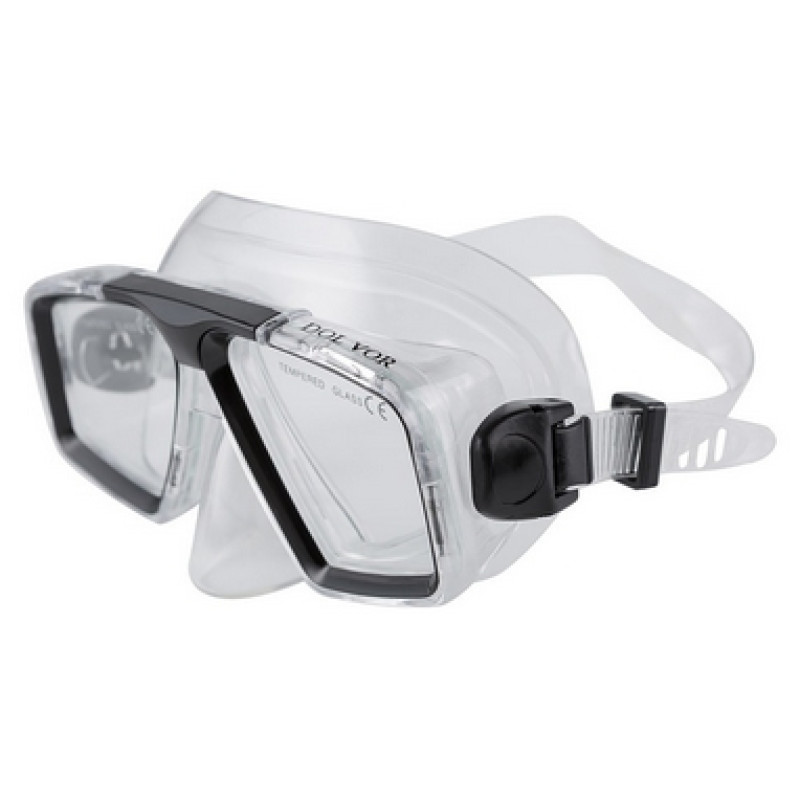 Маска з двома лінзами із 4 мм загартованого скла Dolvor M4204P+SN07P . Конструкція бічних поверхонь збільшує кут зору. Оправа – полікарбонат. Обтюратор із гіпоалергенного медичного PVC вищої якості. Ремінець легко регулюється, пряжка з поворотним механізмом.