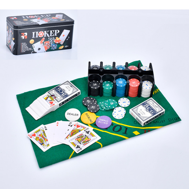 Набір для покеру містить необхідні для гри елементи, а саме: сукно зеленого кольору, 200 фішок, які дозволяють гравцям робити ставки, дві колоди карт, фішку дилера та дві додаткові фішки. Набір упакований у металеву коробку з кришкою, в якій його зручно зберігати та переносити.