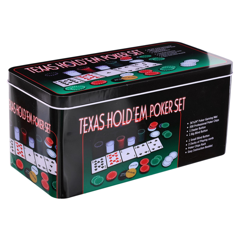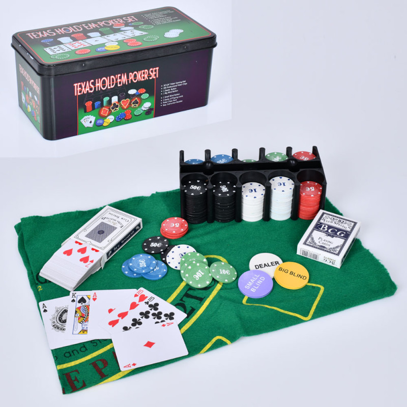 Також в набір входять дві колоди карт, що ідеально підходять для всіх популярних різновидів покеру. Сукно, що входить у комплект, дозволяє створити рівну ігрову поверхню, забезпечуючи легкість переміщення карт і фішок. Все це упаковано в компактну та міцну металеву коробку, яка захищає набір та дозволяє зручно зберігати чи транспортувати його.