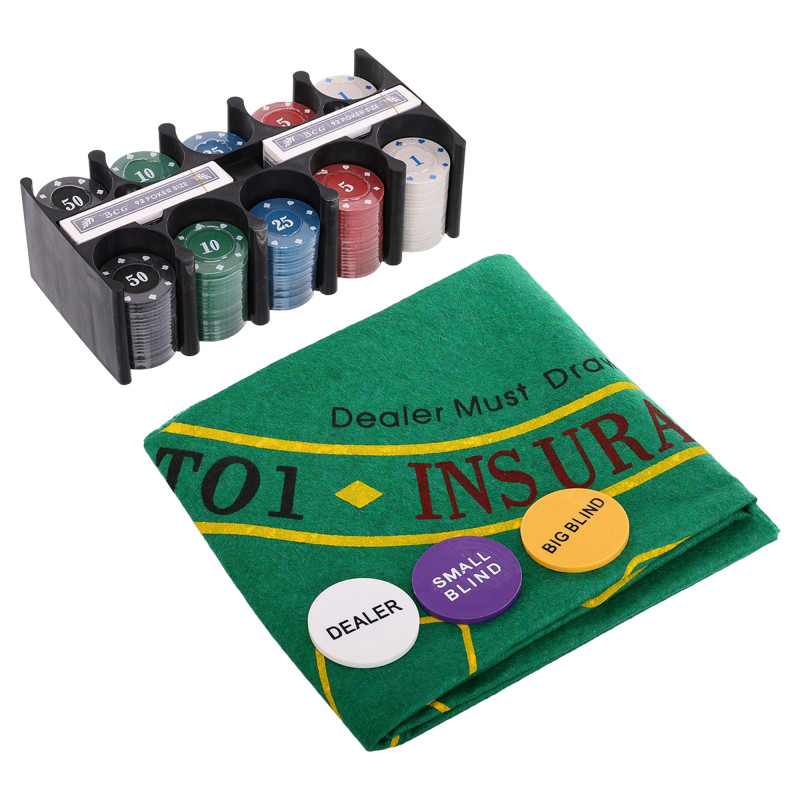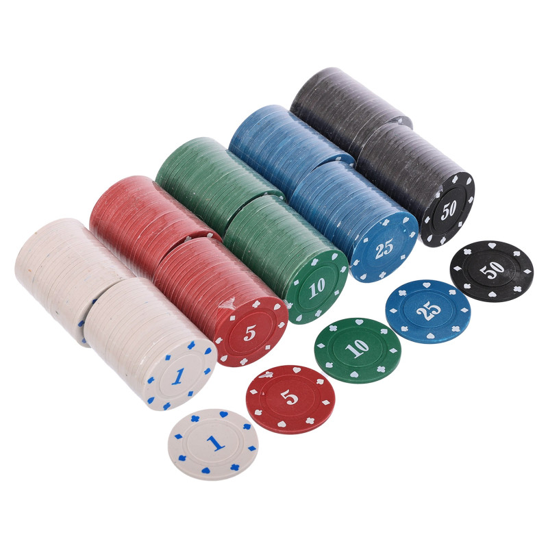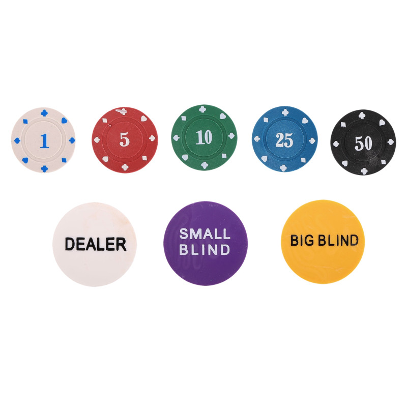 У комплект входить 200 фішок, кожна з яких важить 4 грами та має діаметр 39 мм, що відповідає стандартам покерних фішок. Це дозволяє поринути у атмосферу гри, максимально близьку до професійної. Для зручності та комфорту учасників передбачені два блайнди та спеціальний маркер дилера, що спрощує ведення гри.