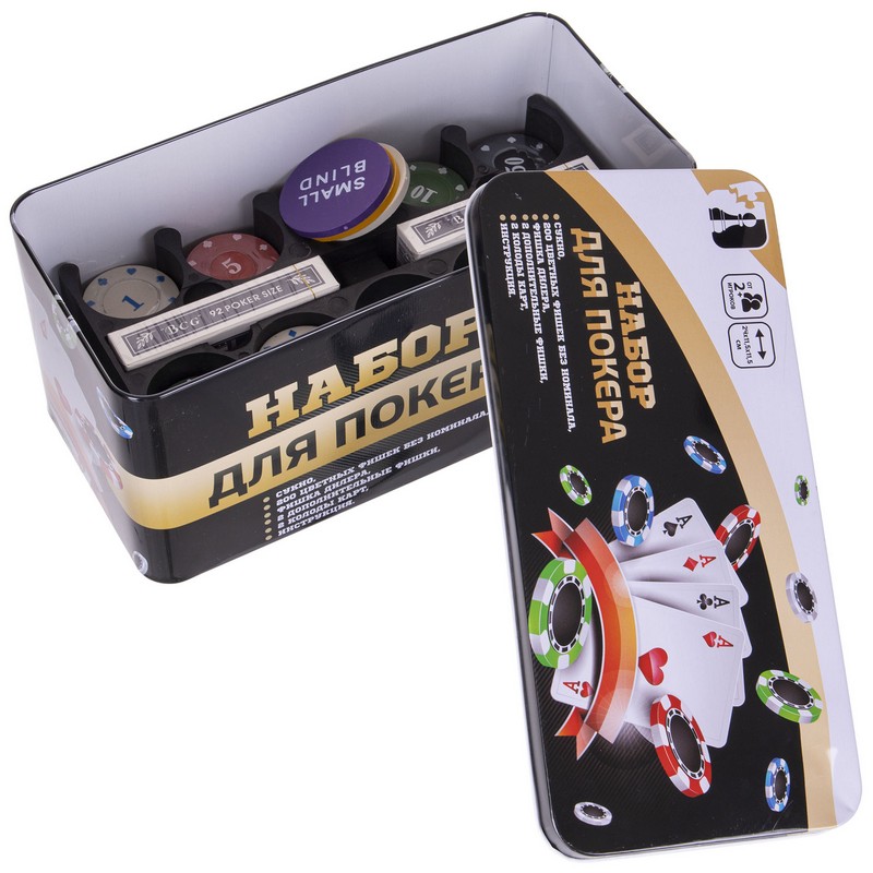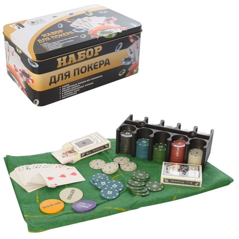 Набір для покеру містить необхідні для гри елементи, а саме: сукно зеленого кольору, 200 фішок, які дозволяють гравцям робити ставки, дві колоди карт, фішку дилера та дві додаткові фішки. Набір упакований у металеву коробку з кришкою, в якій його зручно зберігати та переносити.