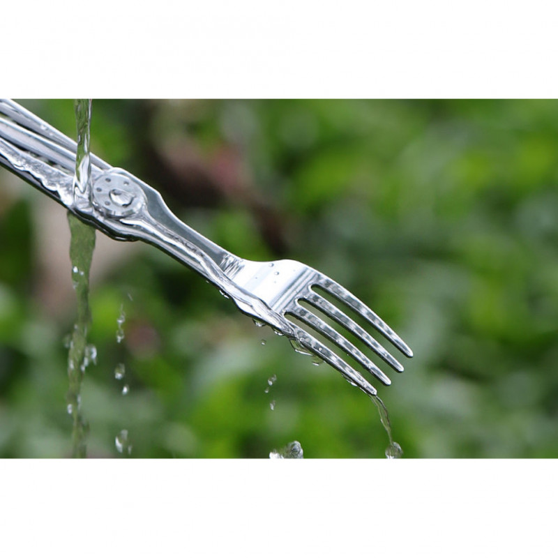 Столові прилади мають складану конструкцію, заощаджуючи 50% місця у зібраному вигляді порівняно зі звичайними нескладаними приладами. Набір важить 76 г і постачається у фірмовому мішечку для зберігання, що захищає метал від подряпин.