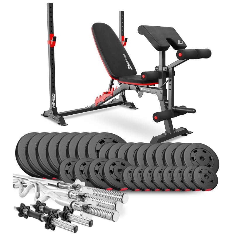 Набір Premium 173 кг зі штангами, гантелями і лавою HS-1095 - ідеально підібраний комплект з функціональною лавкою і найкращим поєднанням кількості і ваги дисків, щоб організувати вдома повноцінний спортзал для силових тренувань.