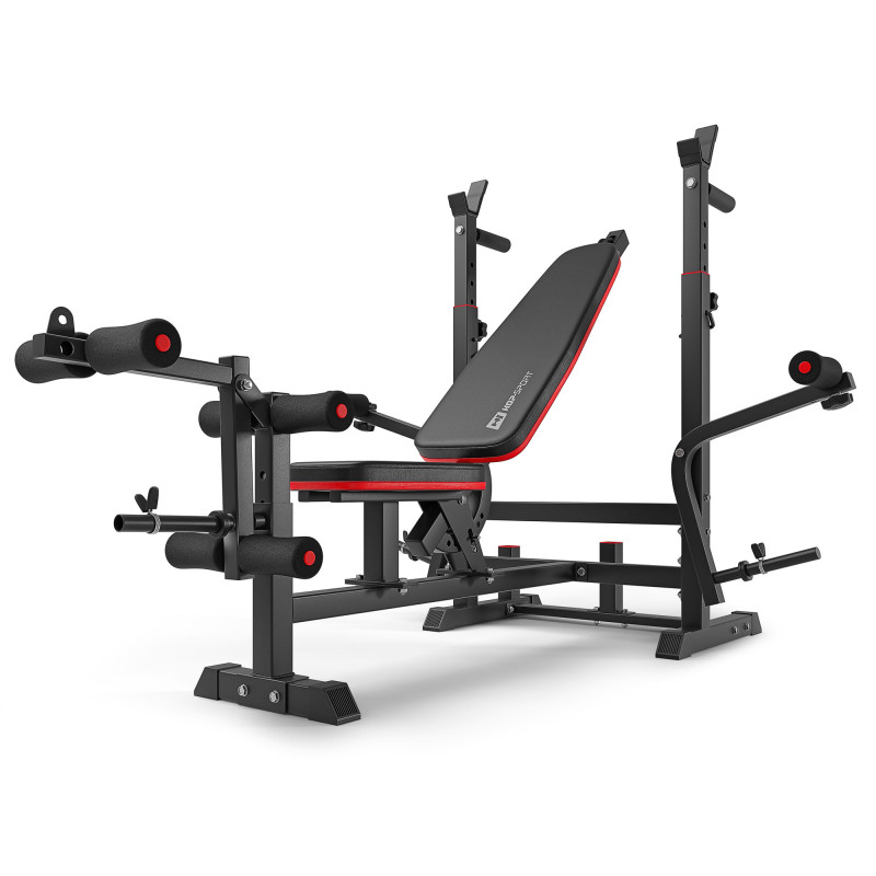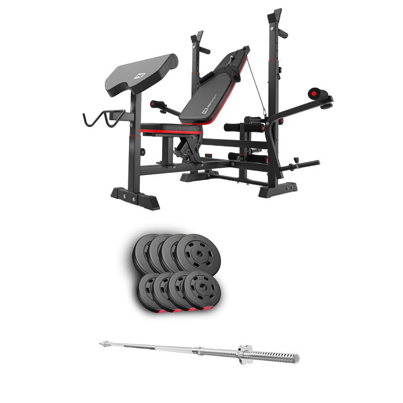 Тренувальна лава HS-1075 Pro від Hop-Sport призначена для тренувань зі штангою або гантелями. Широкий спектр можливостей лавки доповнюють парта Скотта, ручки для віджимань і фіксатор для жиму ногами. Купити штангу з лавкою HS-1075 Pro - відмінне рішення для тренування м'язів грудей, рук, трицепсів, передпліч, плечового пояса і ніг.