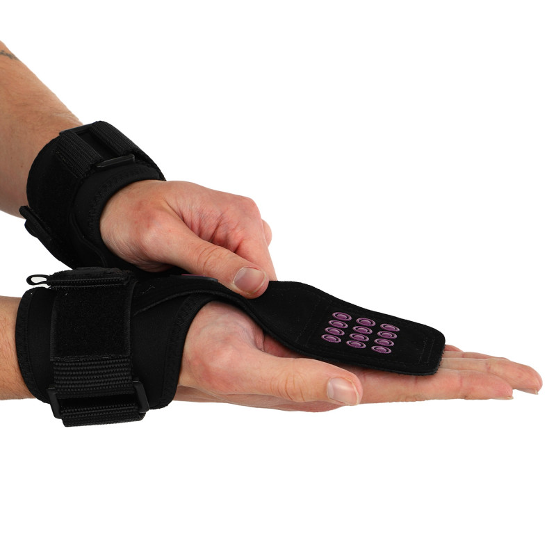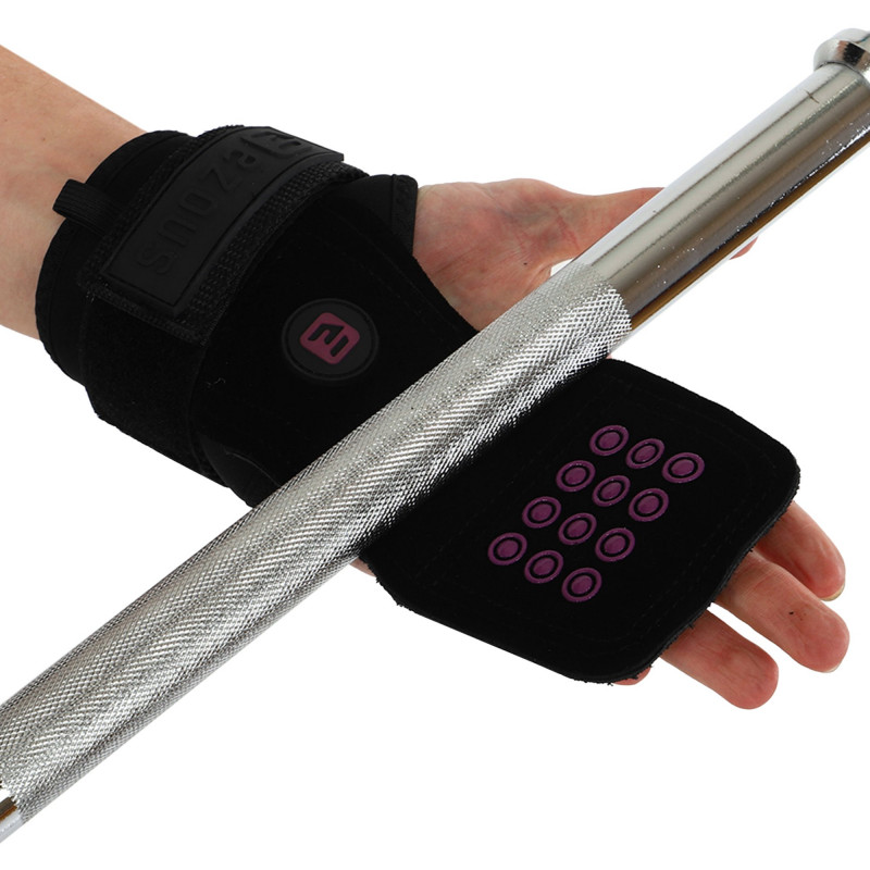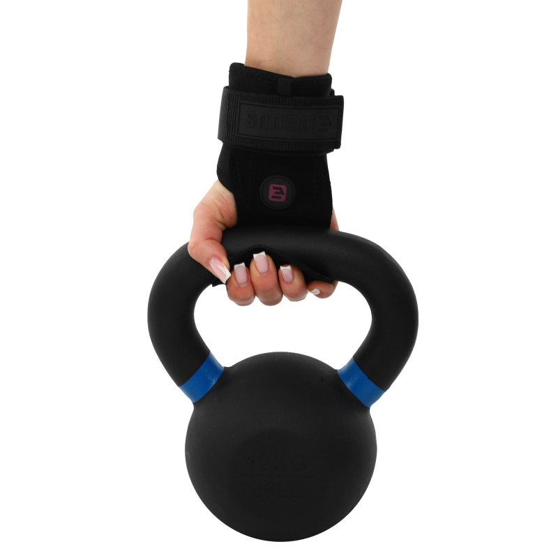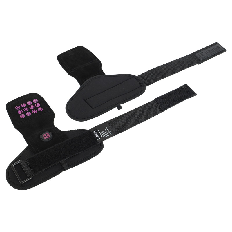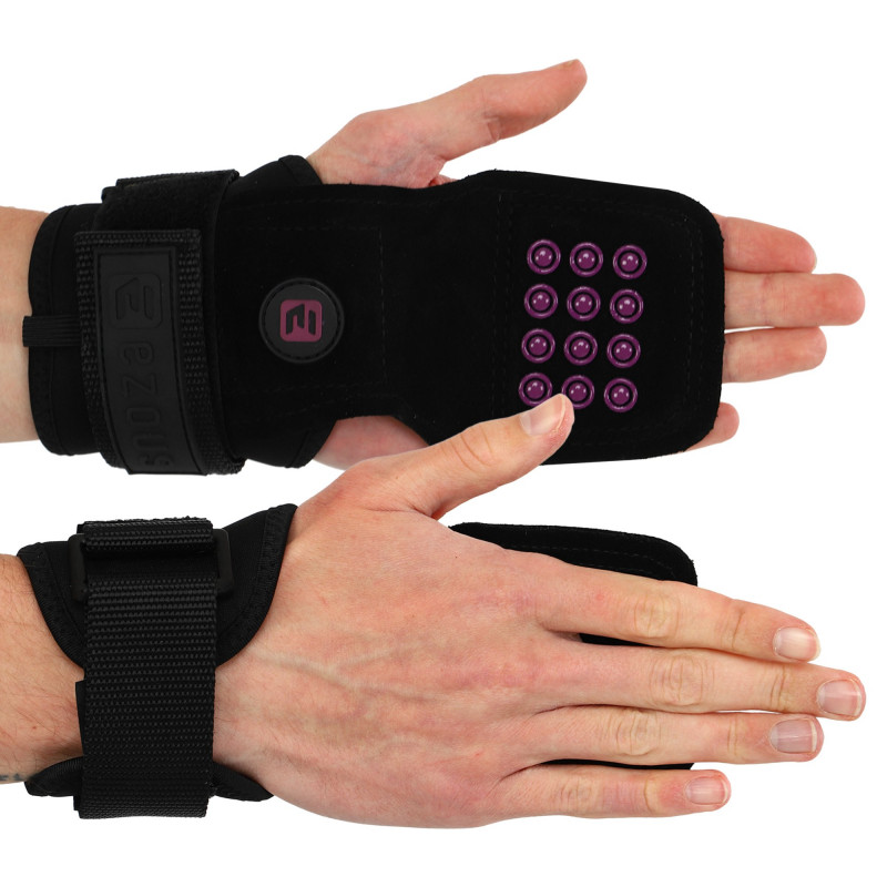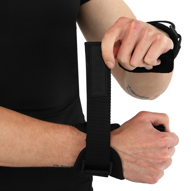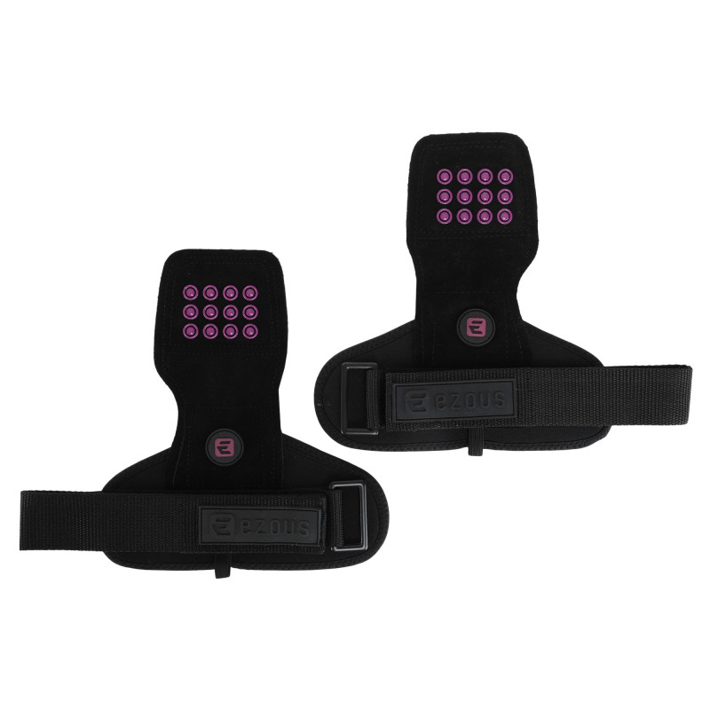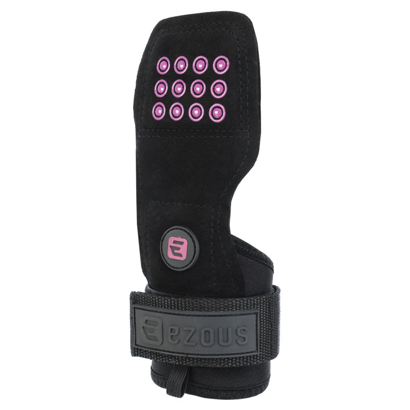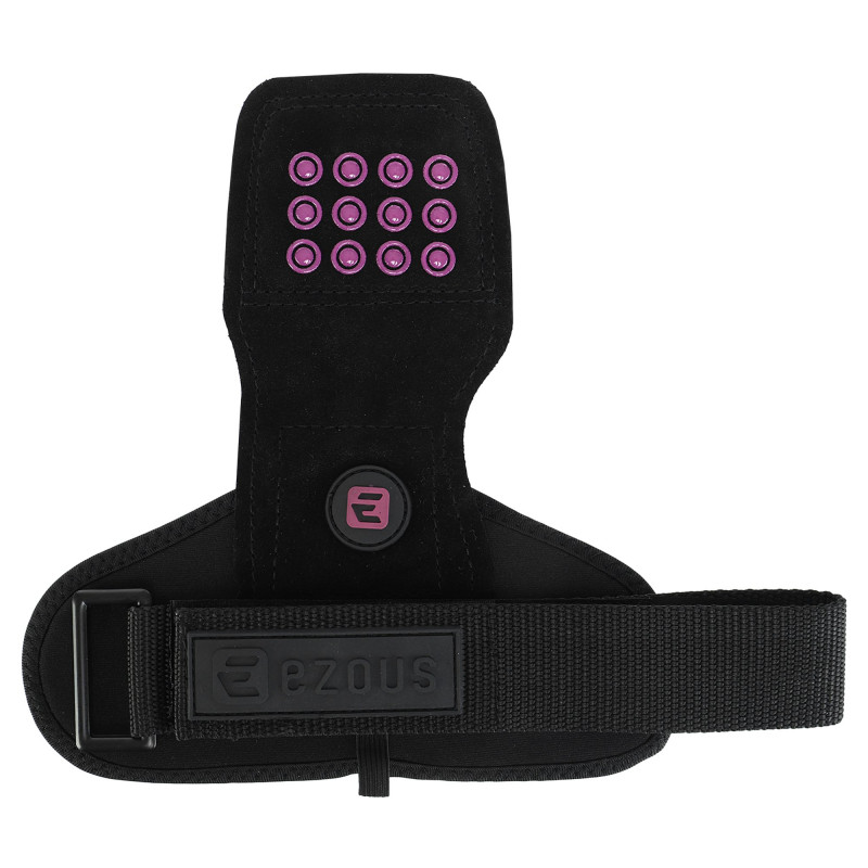 Power Grasp Ezous - це чіпкі та зручні накладки на долоні для підняття ваги. Виріб виконаний зі шкіри, матеріал дуже міцний і підходить для всіх поверхонь. Зовнішня сторона накладок покрита силіконовими крапками для кращого зчеплення. Це забезпечує надійний хват і дозволяє спортсменам працювати з важкими снарядами без страху випадково їх упустити з рук. Широкі манжети захищають зап'ястя від натертостей, їх розмір регулюється липучкою. Металева пряжка для регулювання не торкається шкіри.