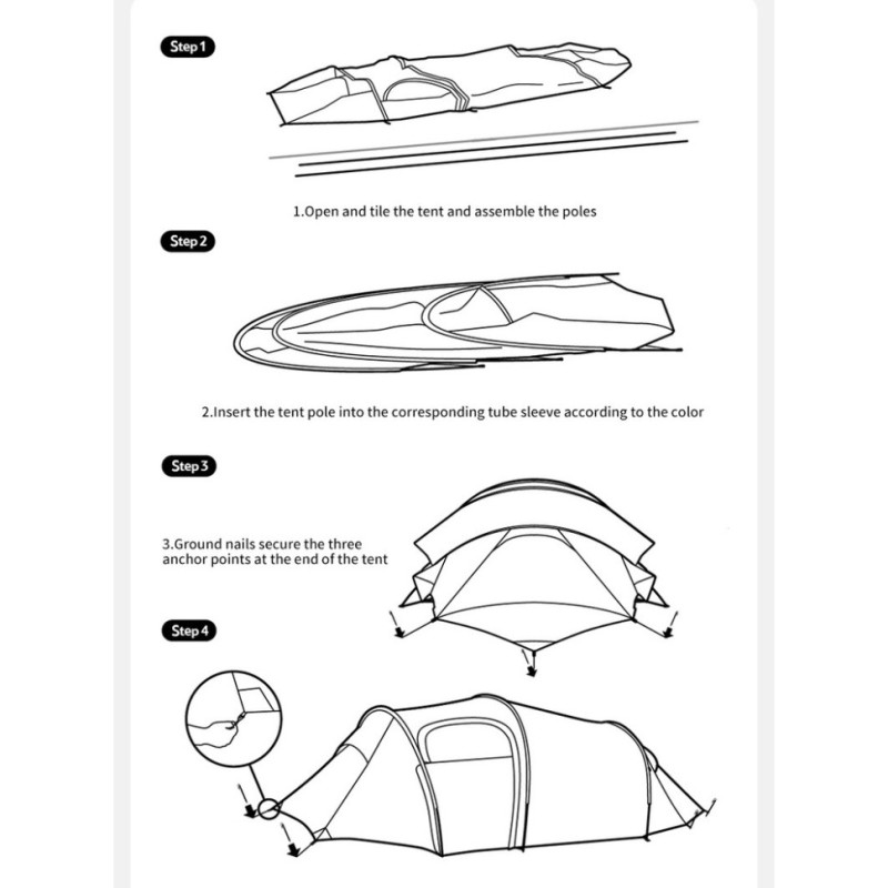 Зовнішній тент, внутрішній намет, 3 х стійки для намету, 8 х вітровідтяжки, 19 х кілочки, сумка для зберігання, ремінець.