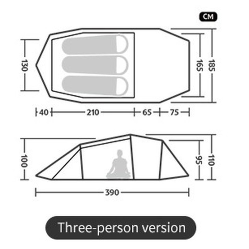 Загальні габарити намету після встановлення сягають 390 х 185 х 110 см. Розміри зони для сну — 210 х 130 см, що ідеально для трьох осіб. Попереду є просторий тамбур для зберігання рюкзаків, взуття та обладнання, щоб звільнити житловий простір.