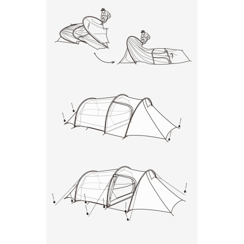 Намет має кілька входів, що зручно не тільки для розміщення кількох людей, а й для природної вентиляції. Вхід до спальної зони закривається москітною сіткою.