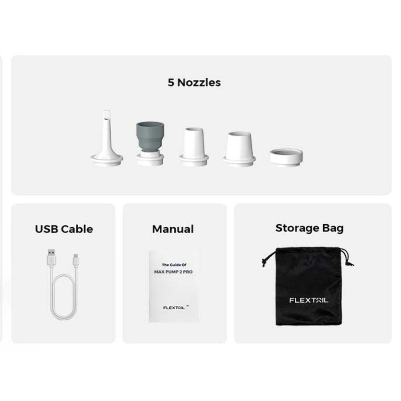 Насос-ліхтар Flextail Max Pump 2 Pro, зарядний кабель USB, 5 насадок, мішечок для зберігання, інструкція користувача.