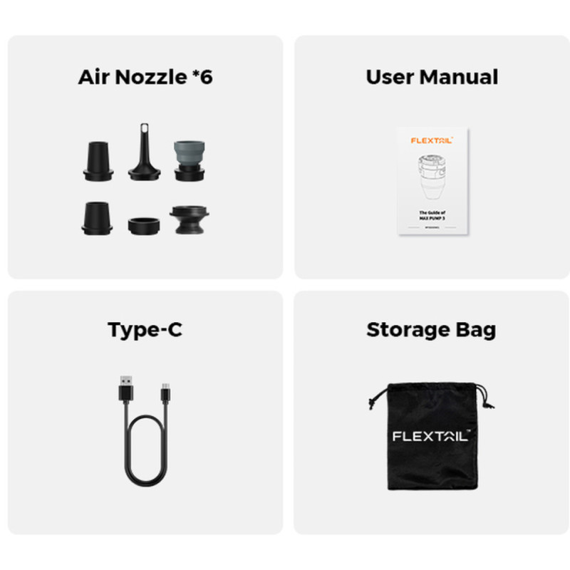 Насос-ліхтар Flextail Max Pump 3, зарядний кабель USB-C, 6 насадок, мішечок для зберігання, інструкція користувача.