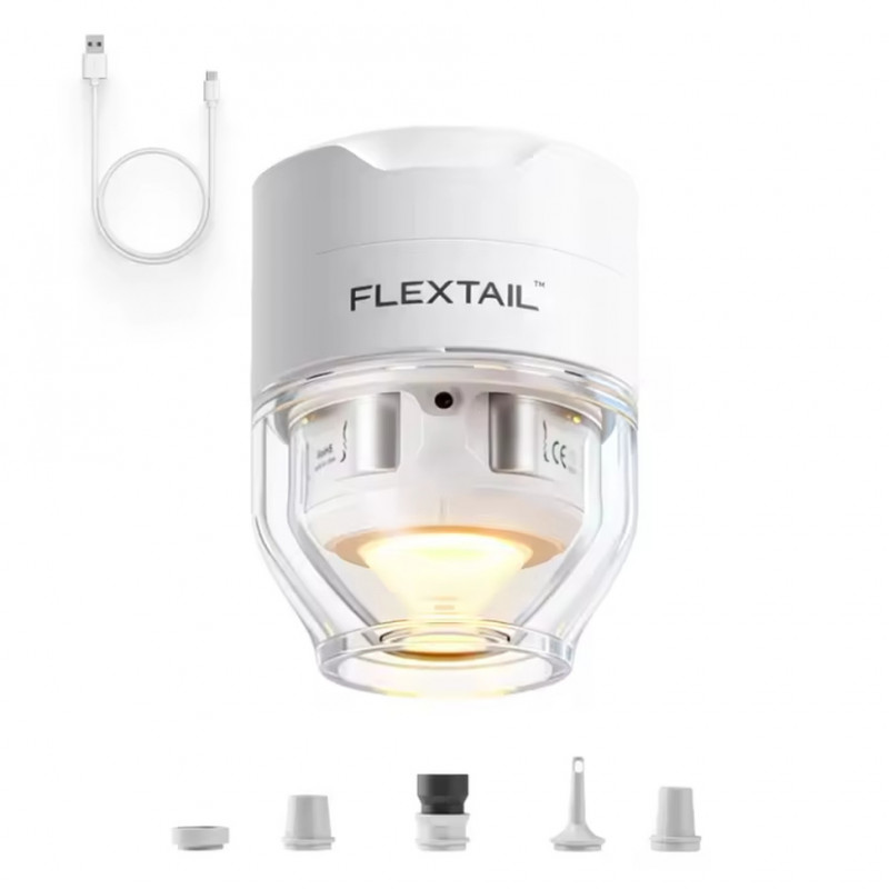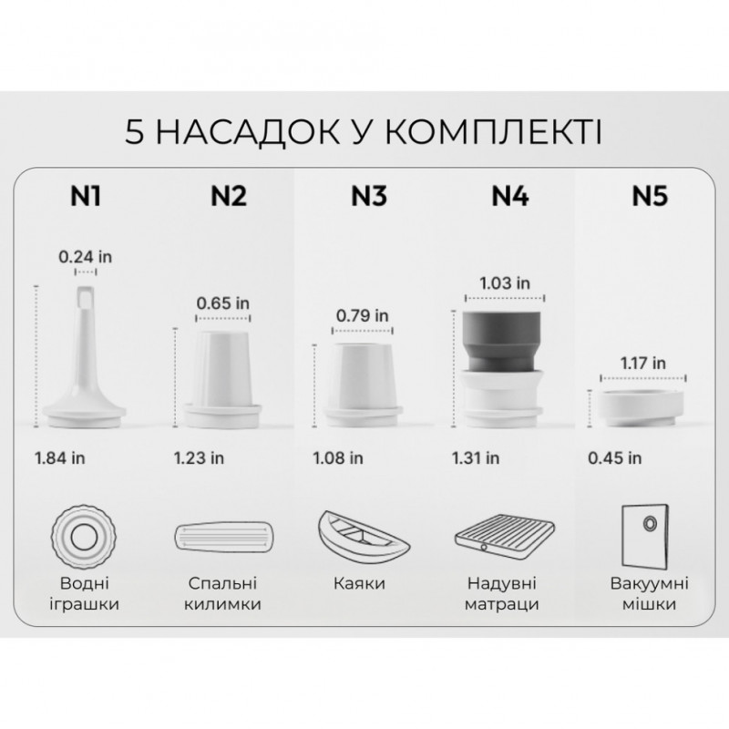 Насос Tiny Pump 3X, набір із 5 універсальних насадок (сумісні з 90% брендів спальних килимків), кабель для зарядки USB Type-C, інструкція користувача.