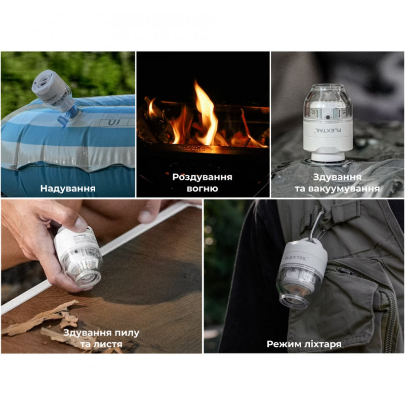 Потік повітря допомагає швидко розпалити вогонь у багатті або очистити об’єктив камери та клавіатуру від пилу.