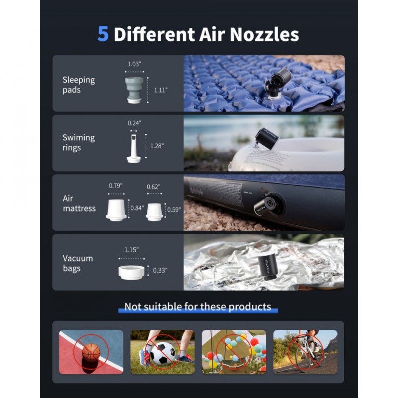 Насос швидко надуває туристичні килимки, подушки, інші надувні вироби та допомагає вакуумувати пакети з речами для економії місця у багажі. За один повний заряд пристрій дозволяє надути до 10–15 туристичних килимків, 12 рятувальних кіл або 1–2 великих матраци.