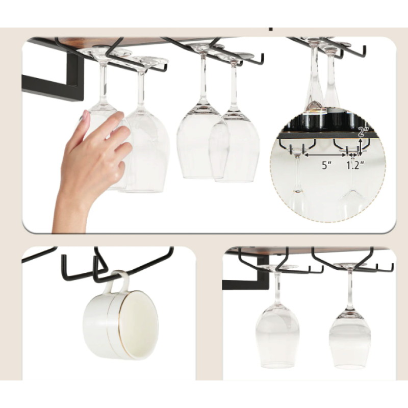 Винний стелаж Costway Lagom - це ідеальне рішення для поціновувачів функціональності та естетики. Завдяки настінному монтажу він заощаджує місце на підлозі, водночас створюючи акцент у вашому інтер'єрі. Його міцна металева конструкція та полички з обробленої деревини надають йому промислового шарму, який чудово пасує як до сучасних кухонь, так і до затишних барних зон. Оснащений тримачем для келихів та захисною планкою, він гарантує зручне та безпечне зберігання пляшок і фужерів. Це не просто полиця - це декоративний та функціональний елемент, який перетворює зберігання вина на стильну виставку.
